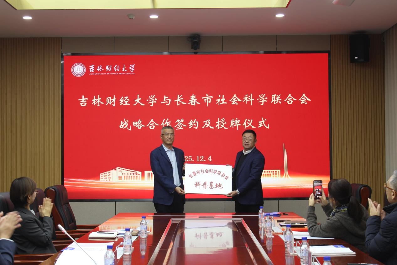 本网讯(会计学院 供稿)为进一步深化校地合作,更好地服务长春经济社会高质量发展,12月4日,学校与长春市社会科学联合会举行“长春市高阶技能人才(决策咨询)实训基地”与“长春市社会科学联合会科普基地”签约授牌仪式。学校党委书记张炳辉,党委副书记、校长马秀颖于签约前会见了长春市社会科学联合会刘颖主席一行并进行了深入交流,副校长祝国平出席并主持签约仪式。