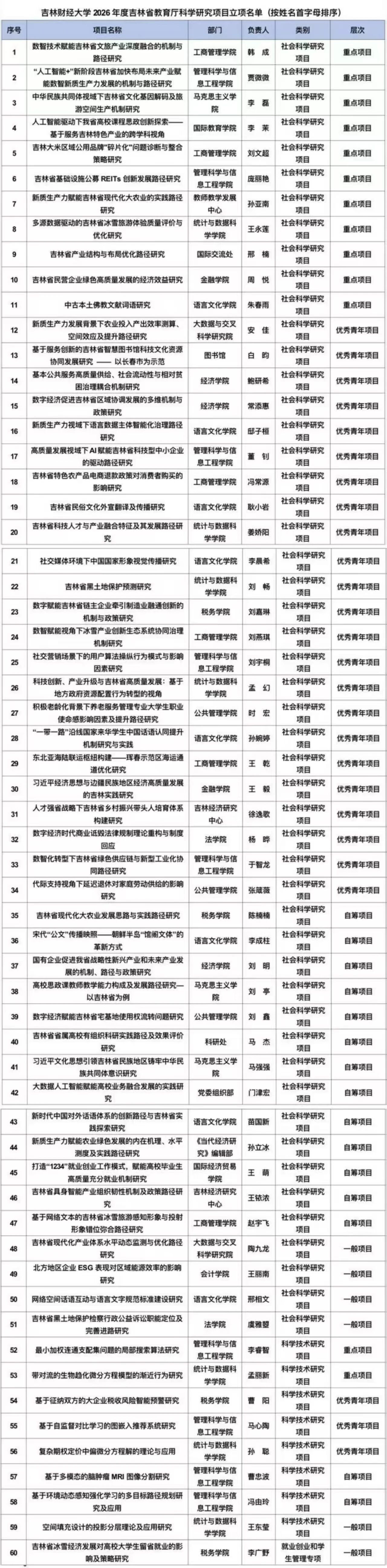 本网讯(科研处 供稿)近日,吉林省教育厅公布了2026年度吉林省教育厅科学研究项目立项名单,Beat365共有60项课题获批立项。其中重点项目13项、一般项目6项、优秀青年项目26项、自筹项目15项。获批项目数量创历史新高。