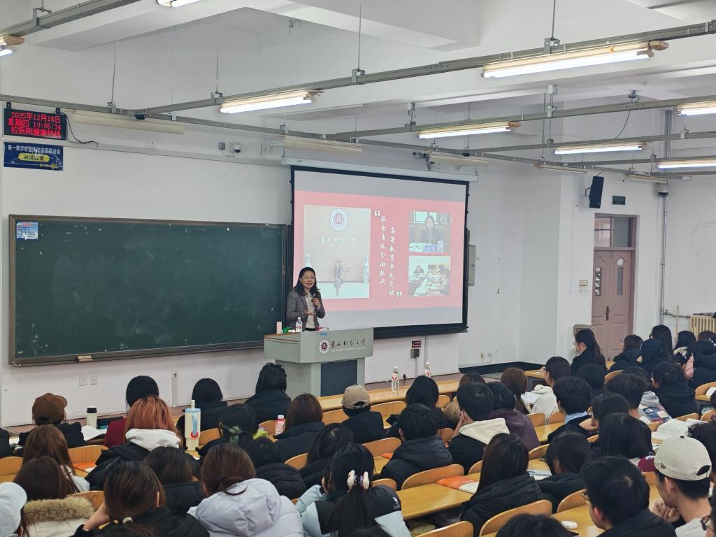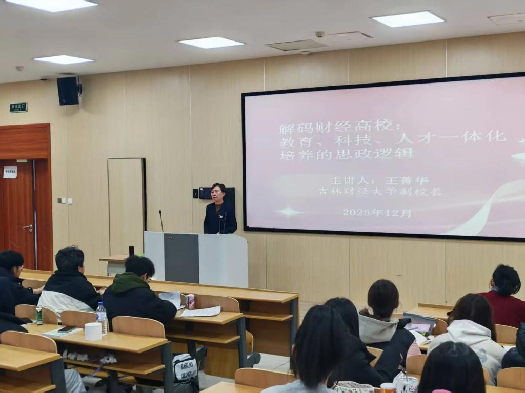 副校长王菁华以《教育、科技、人才一体化培养的思政逻辑》为主题,以“身处财经院校的同学如何将专业能力融入‘十五五’规划部署的国家战略,成长为有担当的财经人才?”为开篇,通过师生互动引入课堂教学主题。她指出,教育、科技、人才是中国式现代化的关键支撑,三者协同联动、系统共生:人才是科技创新的“发动机”,教育是筑牢根基的“压舱石”,科技是教育变革的“催化剂”。对财经学子而言,这份一体化逻辑既是成长坐标系——精准对接区域产业升级制度性需求,把科研成果转化为制度落地经济动能,在提升育人质量的同时,助力区域治理现代化提质增效。她期望同学们能够成为“明制度、懂技术、有情怀”的经世之才,让青春在服务国家经济主战场,推进国家治理现代化的征程中绽放绚丽之花!