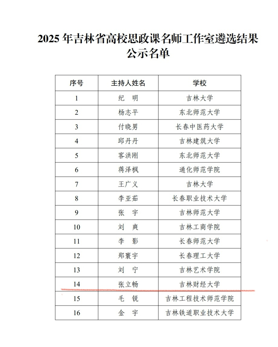 此次评选经高校申报、专家评分、网络公示等环节,共有16个团队入选吉林省高校思政课名师工作室。张立畅教授主持的思政课名师工作室遵循“立德树人、守正创新”的理念,秉持课堂教学是主场,问题导向是核心,教学方法是关键,价值塑造是重点,学生受益是根本的教学原则,聚焦思政课教学质量提升、师资梯队培育与育人模式创新三大核心任务,致力于把工作室建设成为引领思政课教师专业成长的“学习型、辐射型、合作型、研究型”平台。