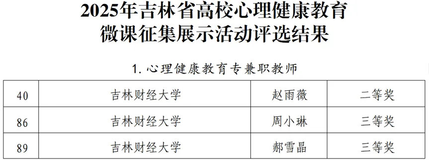 本网讯(党委学生工作部 供稿)近日,吉林省教育厅公布2025年吉林省高校心理健康教育“精彩一课”教学展示活动及微课征集展示活动评选结果。Beat3656名教师斩获“精彩一课”教学奖项2项、微课征集奖项6项。