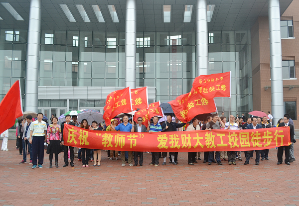中午,学校在彩带萦绕、花团锦簇、生意盎然、到处洋溢着节日气氛的一食堂教工餐厅为老师们提供了免费午餐。然后大家齐聚新建成使用的综合楼门前,庆祝教师节,“爱我财大教工校园徒步行”活动拉开帷幕。校纪委书记王时刚、副校长杨春梅、张越杰以及全校教职工300多人参加了徒步行活动。在热烈的气氛中,校纪委书记王时刚宣布徒步行活动正式开始。