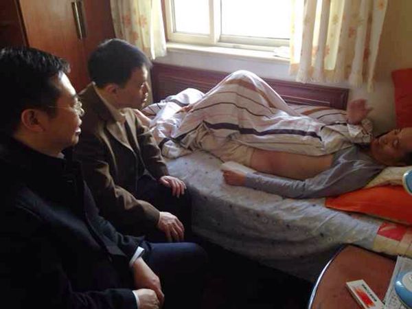 受广大校友们的重托,陈军副会长、王道田秘书长和贺罡校友专程去看望金庆明校友,并将第一批饱蘸着情谊与珍重的捐款,送到了金庆明的病榻前,令大家焦虑的是:金庆明在医院治疗的效果并不理想,腹部严重积水、无法进食、甚至无力靠自身的力量坐起来。金庆明和家庭的状况都很令人揪心,而年迈的父母也不远千里从东北赶到了儿子的身边,他们亲眼看到校友们前来探望禁不住流出了热泪。陈军把大家的爱心和问候转达给了金庆明,捧起校友们饱含着爱心的捐款,金庆明禁不住深受感动,热泪满眶,紧紧拉着陈军的手不肯放松。而年过七旬的老母亲拉着陈军的手:“你们来看庆明,庆明的情绪就好多了,本来为了治病,我们已经准备回老家卖掉房子继续给孩子治疗,你们带来的钱够用一阵子,真谢谢你们。”