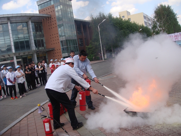 此次演练分为疏散和消防常识两个方面。随着消防报警声的响起,饮食服务中心管理人员迅速组织各班组员工依据疏散路线快速、有序地疏散到了室外。整个疏散过程紧张而有序的进行。而后,饮食服务中心刘义权副主任与消防科王刚科长先后对全体员工进行了简单的消防安全意识与知识培训,从如何报火警、火灾的预防、火场自救及逃生方法等消防安全基本常识进行了讲解。还现场演示了灭火器的操作程序,并让员工实际操作灭火器灭火,掌握了正确使用灭火器的方法。