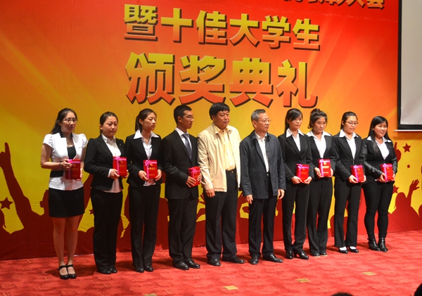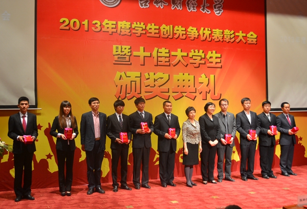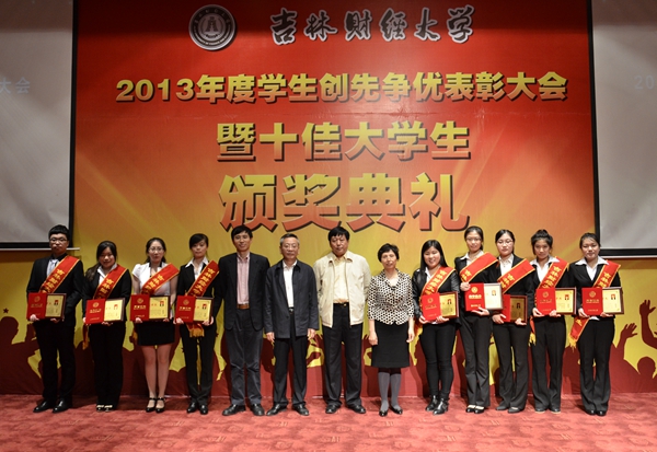 颁奖结束后,进行了2013年度十佳大学生颁奖典礼。为表彰先进、树立典型,鼓励学生刻苦学习、奋发向上,在校党委的指导和大力支持下,学工处积极制定评选方案,历时2个多月时间,通过网络投票、教师及学生代表投票,最终评选出Beat3652013年度十佳大学生。他们是金融学院王丹丹、新闻与传播学院李爽、公共管理学院王梦思、国际交流学院张雨倬、统计学院安佳、经济学院谢青青、会计学院孟玉、会计学院朱茜、管理科学与信息工程学院周丽、亚泰工商管理学院李俊彦。