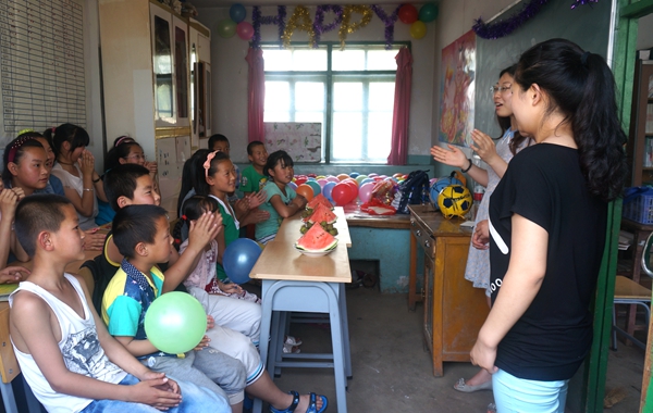 在联谊活动开始之前,志愿者给孩子们准备了水果、零食、糖果等食物,用彩带、气球等精心布置了活动场地,室内外都洋溢着儿童节轻松快乐的气氛。随后,志愿者将学生们召集到了教室,张爽老师详细了解了他们近期的学习及生活情况,并鼓励孩子们一定要好好学习,将来考上理想大学,报答父母,报效祖国。