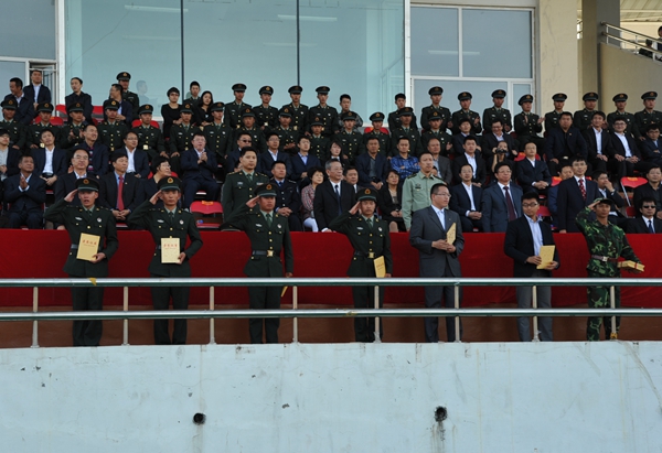 开学典礼暨军事课总结表彰大会在庄重的国歌声中开始。经过三周的紧张训练,2014级新生在吉林省军区和装甲兵技术学院各位教官的指导下,高标准地完成了这次军事技能训练和军事理论学习,培养了不怕困难、敢于吃苦、雷厉风行、团结协作的意志品质。