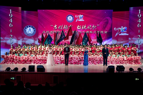 晚会上,离退休老干部表演的“欢乐的老年时光”时装秀洋溢着幸福快乐的老年生活,赢得阵阵掌声;青岛校友陈军的诗歌朗诵《献给母校的挚爱》和北京校友的合唱《时光相会》更是勾起大家昔日在母校生活的点点滴滴;教师代表朗诵的《今夜,为财大举杯》述说了财大七十年的风雨兼程;师生同台表演的《琼枝绽放》歌曲串烧体现了朝气向上的校园生活;《绮丽华彩》、《传承》、《师说》、《我爱你中国》、《爱与青春》、《时光相会》等学生表演的节目弘扬了尊师重教的优良传统,展现了当代大学生的青春活力,充满了对吉财明天的美好祝福。