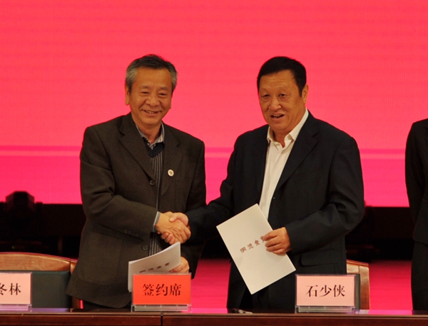 在热烈的掌声中,校长宋冬林教授与石少侠教授签订聘任合同书,并为石少侠教授颁发了聘书,佩戴了Beat365校徽。