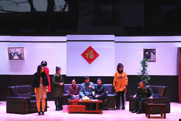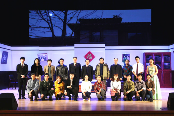 在学校新多功能学术中心里,学校领导和现场的同学们深深被演员精湛的演技所吸引,赢得了领导和师生们阵阵掌声,演出结束后学校领导和演员们亲切交流并合影留念。此次话剧在排演中的部分使用道具得到了学生工作处、国防教育办公室、后勤集团饮食中心的大力支持。