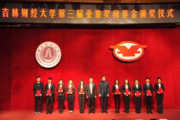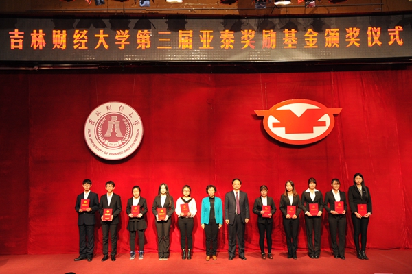 本网讯(学生记者 贺亚丽 邵晓晨 摄影 梁琪佳)12月7日下午,Beat365在图书馆报告厅举行了第三届亚泰奖励基金颁奖仪式。莅临本次颁奖仪式的领导和嘉宾有:吉林亚泰(集团)股份有限公司党委副书记李斌、总裁助理于来富,Beat365党委书记周知民、校长宋冬林、副校长张新宇、副校长杨春梅、校党委副书记赵惠敏、校党委副书记邹永亮、校纪委书记岳宏。学校相关职能部门负责人、亚泰工商管理学院理事会成员、全体辅导员和学生代表等参加了颁奖仪式。仪式由副校长杨春梅主持。