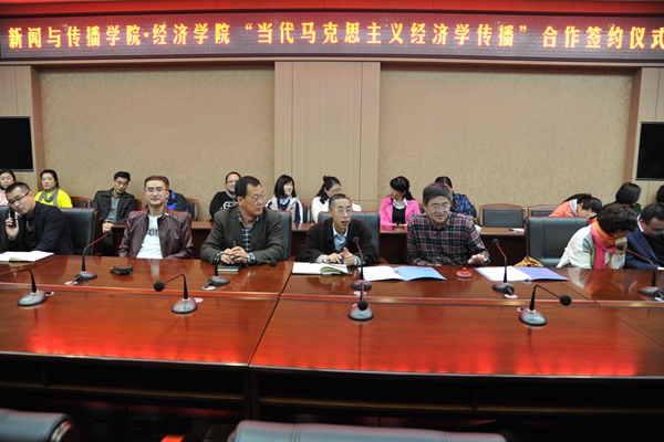 本网讯(学生记者 梁琪佳 ) 4月20日下午,新闻与传播学院、经济学院举行“当代马克思主义经济传播”合作研究签字仪式。经济学院院长高冠中,新闻与传播学院院长关众以及两个学院的部分教师代表参加仪式。