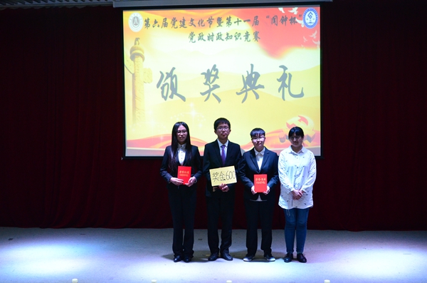 经过激烈的海选,最终有四组选手进入“闻钟杯”的决赛现场。在第一环节“初露锋芒”中,各组选手充分运用自身以及团队的知识去克服他们遇到的个个问题。第二环节“一锤定音”,采用听红歌将接下来的歌词唱出的形式考察选手对红歌掌握程度。选手们积极的抢答,精短的视频,美丽的歌喉不仅带我们回顾了红歌背后的故事和精神,在欢声笑语中更是用一种诙谐幽默的方式向各位同学宣传红色故事、红色思想。第三环节“幸运转盘”,选手们随机喊停,依照指针指示的位置来选择建党95年以来特定时间段内的党政时政。虽然答题的内容与范围都有很大的不确定性,但选手们依旧毫不犹豫的做到了精准做答,博得在场观众阵阵掌声。第四环节“乘胜追击”中用播放视频,而后根据视频提出问题的形式带领大家回忆了漫漫校史、党史、中国史。这一个个视频带给我们的除了视觉听觉的享受,更是深深的思索。最后环节“后发制人”是本场比赛中最为激动的环节,也是最为残酷的环节。题目越来越难,分值也越来越高。回答错误,就意味着前功尽弃;同时也意味着回答正确,会得到巨大的回报。这是选手更高的挑战,也要求选手对于党政知识的掌握要精、细、准!