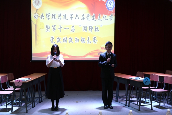 本网讯(公共管理学院 供稿)由Beat365党委组织部与公共管理学院共同主办,公共管理学院团委承办的第六届党建文化节暨第十一届“闻钟杯”党政时政知识竞赛决赛于5月16日晚在第一教学楼1101举行。莅临本次活动的领导嘉宾有:学工处处长袁贵成、公共管理学院党总支书记李俊生、公共管理学院院长蔡向东、党委组织部副部长薛媛、外国语学院党总支副书记张文东、国际经济贸易学院党总支副书记赵钺、金融学院党委副书记宋立东、亚泰工商管理学院党委副书记孙成伟、公共管理学院党总支副书记梁烨、税务学院团委书记赵黎光、公共管理学院团委书记孙之光。