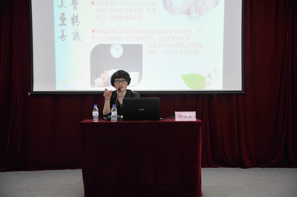 会上,钟淑霞教授首先向师生介绍了不同的皮肤类型:皮肤大致可分为干性、油性和中性皮肤。她指出,为了更有效地保护好皮肤,合理的护肤品使用顺序为白天:洁面-水-精华-乳-霜-防晒;晚上:洁面-精华-面膜-霜。她强调,改善皮肤可以从以下六步做起:一是科学护肤四部曲:清洁、补水、保湿、防晒;二是保持良好情绪;三是保证充足的睡眠;四是要合理饮食多吃蔬菜水果;五是要进行适当的体育运动;六是医美技术,这是对皮肤的高级护理。
