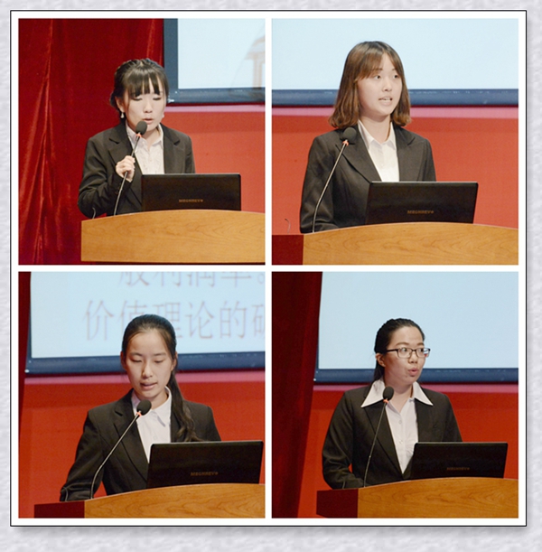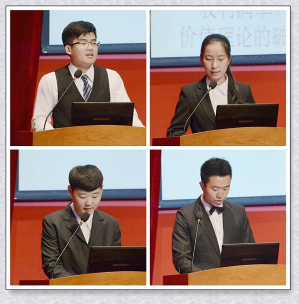 本届论坛从参加2015年度经济学院本科生《资本论》全卷辅导计划的121名本科生撰写的70余篇论文中,评选出三等奖论文12篇,一、二等奖候选获奖论文14篇。进入本科生优秀学术成果展示环节,14篇一、二等奖候选获奖论文的作者依次上台进行了学术成果展示。这是继2015年12月17日首届论坛之后的第二届论坛。第一届论坛的主题是对象和方法。这次会议的主题是劳动价值论的基本理论。青年马克思主义学者分别就劳动价值论与西方经济学的边际效用价值论的比较、价值决定和两重含义的社会必要劳动时间等问题进行了学术研讨。14位演讲者充分展示了自己两年来显著的学习成果和学术内涵。台上的他们侃侃而谈,思路清晰敏捷,他们有着青春的活力,也有着学术研究应具备的严谨品质。充分展示了马克思主义经济学的科学性和真理性。评委老师根据同学们的现场表现和论文内容逐一进行打分,并最终评选出一等奖论文6篇,二等奖论文2篇。