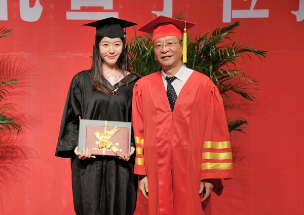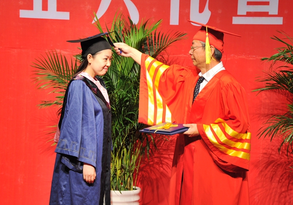 随后,在欢快的音乐中,校学位评定委员会主席、校长宋冬林为毕业生颁发了毕业证、学位证,同时扶正流苏。正冠扶苏不仅是2016届学生正式毕业的标志,更是校领导代表学校对毕业生求学的肯定与衷心祝福。在将近一个小时的时间里,校长宋冬林以一位老师对学生的关爱之心,以一位长辈对晚辈的爱护之情,亲自将每一位毕业生的流苏扶正,并在合影中将母校最美好的祝愿和祝福送给了他们。这一刻,也将成为2016届毕业生人生中最珍贵和最难忘的记忆。