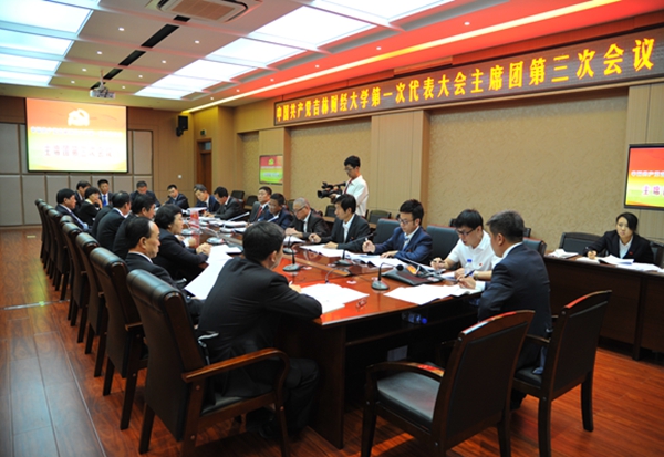 副校长丁堡骏主持召开了主席团第三次会议。会议听取了各代表团推荐大会监票人情况汇报,通过了大会监票人名单,提出了大会总监票人建议名单;听取了各代表团对党委工作报告决议(草案)、纪委工作报告决议(草案)讨论情况的汇报;听取了各代表团对《大会选举办法》(草案)讨论情况的汇报,审议通过了《大会选举办法》(草案);听取了各代表团《关于全校党费收缴、使用和管理情况的报告》讨论情况的汇报,通过了《全校党费收缴、使用和管理情况的报告》;听取了各代表团对下届党委委员、纪委委员候选人建议名单讨论情况的汇报,确定了预选候选人名单。