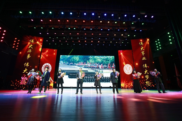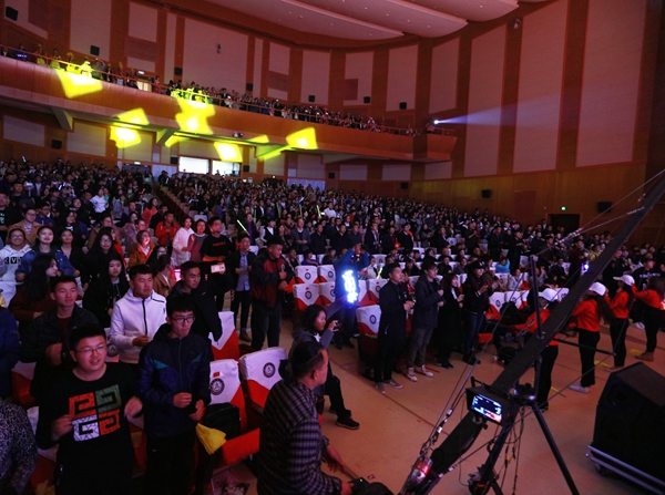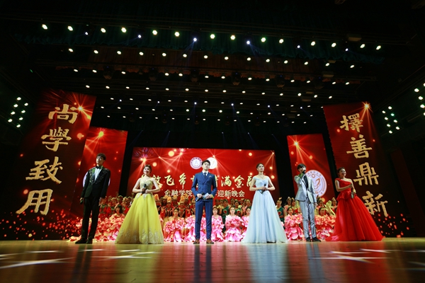 表彰大会结束后,金融学院“放飞希望,情满金融”2017年迎新晚会正式拉开帷幕。今年的迎新晚会得到了学生家长的热烈关注,共有三十多位2017级学生家长莅临晚会现场;学院还充分利用新媒体,向全体家长进行网络平台直播,受到了学生家长的高度赞扬。院旗飘展、红绸飞扬,2017级新生表演的开场舞《欢聚一堂》点燃了现场的激情;宋俊杰和孙晔同学合唱的歌曲《天耀中华》诠释财大青年对祖国深深的热爱;歌曲联唱《恋曲2017》、2017级研究生舞蹈《律动2017》、戴序老师的独唱《追光者》、金融学院大学生艺术团带来的舞蹈《歌舞青春》、乐器联奏《凉凉》、少数民族同学舞蹈《缤纷华夏》、金融风采秀《怦然心动》、辅导员节目《钢铁金融》等节目精彩纷呈。在教师代表表演的合唱《我爱你中国》的歌声中,全场观众挥舞手中的国旗,共同为祖国祝福。晚会的最后,金融学院全体老师与2017级学生代表合唱《我们在长春相遇》,歌词中“在那银色的冬天里,我们在长春相遇,我们在金融相聚”将全场晚会气氛推上高潮。