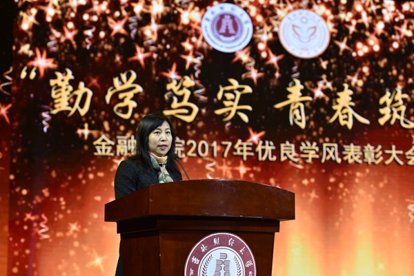 优良学风表彰大会由金融学院副院长王丽颖主持,金融学院党委副书记宋立东宣读了《关于表彰2016—2017学年学风建设先进集体和先进个人的决定》,金融学院院长唐亚晖代表学院致辞,国家奖学金获得者冷新宇同学代表获奖同学发言,与会领导分别为获得表彰的先进集体和优秀个人代表颁奖。