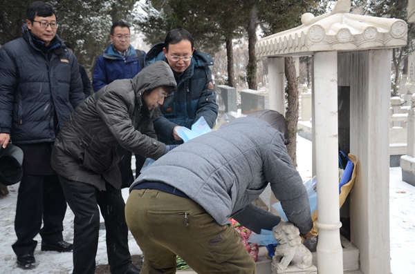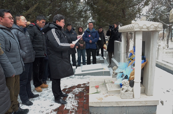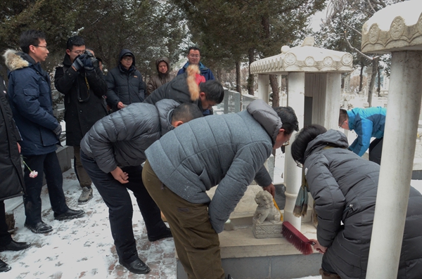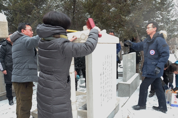 上午9点30分,参加祭扫的毕业学生记者来到吕金华老师墓前默哀,表达对吕老师的深切怀念。随后,大家仔细清扫了墓碑上的积雪和灰尘,并逐一献花、祭酒。随后,Beat365首届大学生记者团团长、沈阳《华商晨报》社长兼总编刘庆诵读了《祭恩师歌》。