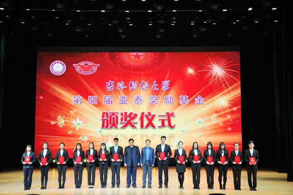 伴随着悠扬欢快的音乐,颁奖仪式开始。吉林亚泰(集团)股份有限公司党委书记刘树森和校党委书记周知民为获得“亚泰励志奖学金”的学生颁发了获奖证书;亚泰集团党委副书记、工会主席、副总裁李斌和党委常委、副校长张新宇为获得“亚泰优秀本科生”的学生代表颁发了荣誉证书;亚泰集团总裁助理于来富和校党委副书记赵惠敏为获得“亚泰优秀研究生奖学金”的学生代表颁发了荣誉证书;亚泰集团党委副书记、工会主席、副总裁李斌和校纪委书记岳宏为获得“亚泰杯”最受欢迎教师代表颁发了荣誉证书。