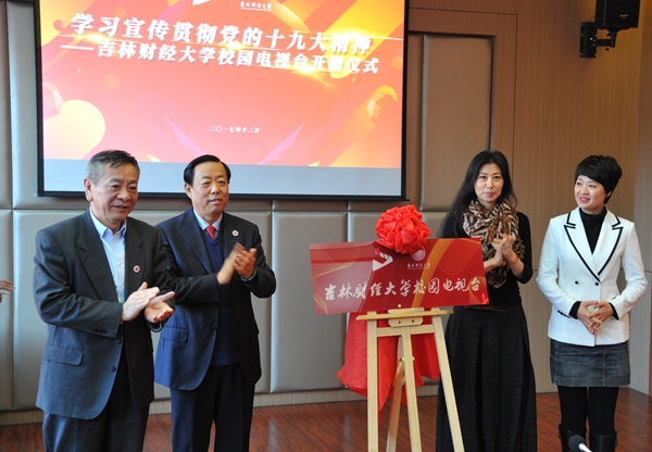 随后,在热烈的掌声中,校党委书记周知民,校党委副书记、校长宋冬林,吉林省广播电视艺术家协会副主席、秘书长王融,吉林电视台守望都市主持人、首席播音员郭佳共同为Beat365中文官方网站校园电视台揭牌。