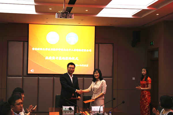 本网讯 (应用数学学院 供稿)5月17日,应用数学学院与太平人寿保险有限公司在综合楼第二会议室举行实习基地签约仪式。太平人寿保险有限公司人力资源部经理刘超、陈俊羽,副校长张新宇,学工处处长袁贵成,教务处处长兼国际经济贸易学院院长王云凤,应用数学学院院长李秀玲,直属党支部书记李兆伟,副院长曹忠威,系主任王慧敏、郑佳,分团委书记袁冬梅以及学院全体专任教师和部分学生代表出席了此次签约仪式。签约仪式由李兆伟书记主持。