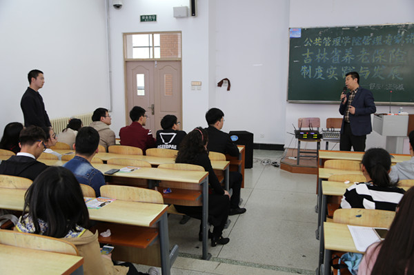 本网讯 (公共管理学院 供稿)为丰富教学内容,加强实践教学,引导学生了解公共管理领域的实际情况,培养公共管理应用型人才,公共管理学院定期举办“管理专家讲堂”,至今已成功举办四次,在师生中获得广泛好评。4月26日,公共管理学院第五期“管理专家讲堂”在第一教学楼1111教室举行。主讲嘉宾是吉林省人力资源和社会保障厅养老保险处处长王传禛,主题是“吉林省养老保险制度实践与发展”。参加本次活动的有公共管理学院全体师生。