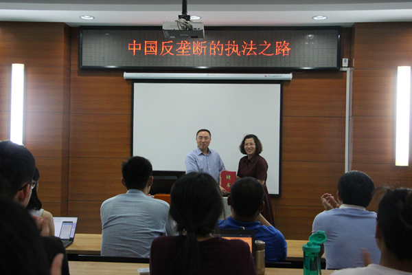 本网讯(法学院 供稿)6月8日下午,法学院邀请商务部条约法律司原司长、首任反垄断局局长、WTO研究中心竞争政策与法律委员会主任、国务院反垄断委员会咨询专家尚明在卓越法律人才教室为法学院师生作主题为《中国反垄断的执法之路》的学术讲座。报告会由法学院名誉院长石少侠教授主持,现场座无虚席。讲座前,法学院党委书记王丽萍为尚明司长颁发了聘书,尚明司长被聘为法学院的客座教授。
