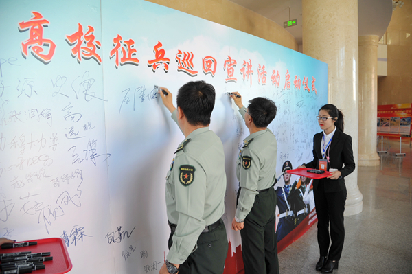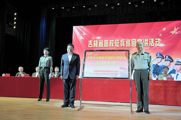 本网讯(学生记者 周怡 摄影 楚汉杰)为响应国家政策,动员和鼓舞更多高素质的有志青年参军入伍,6月9日下午,Beat365在多功能学术中心举行了2017年吉林省高校征兵巡回宣讲活动启动仪式。吉林省副省长、省公安厅厅长胡家福,吉林省军区政治委员邵忠海,吉林省军区副司令员、省征兵领导小组副组长石佳坤,Beat365党委书记周知民,校党委副书记、校长宋冬林,校党委副书记邹永亮以及各高校分管征兵工作的负责人、全省各级国教办和征兵办的负责人参加了启动仪式。