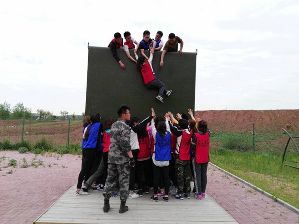 本次培训在团队建设破冰展示中拉开帷幕,随后全体学员进行了简单的热身并被划分为黄、绿、红、粉四个小组。参训项目有图片识别、高空断桥、毕业墙,其中难度最大的当属高空断桥项目,在该项目进行过程中,多数学员心生恐惧、停止不前,但在老师及组员的鼓励下最终克服心理阻碍,成功迈出脚步并顺利通过。最令人难忘的是毕业墙翻越训练,这一项目的难点在于徒手翻越高四米且光滑、无着力点的墙壁。同学们通过研究后决定采用“叠罗汉”的方式用自己的身躯为基石,以肩膀作为着力点帮助组员翻越障碍。不管过程多么艰辛、身体多么疼痛,他们紧咬牙关、通力协作,最终完成任务。很多同学身上都留下一道道血痕,大家留下了激动的泪水,老师对各位同学的表现给予了充分的肯定与认可。