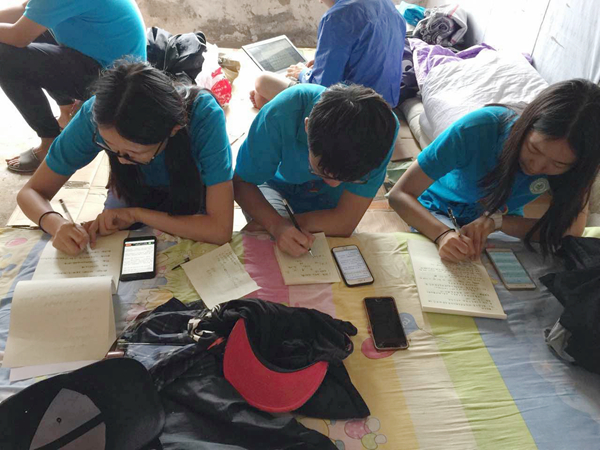 在支教活动中,志愿者们7月20日从长春出发,乘坐40多小时的火车与4小时的客车,经过三天两夜的长途跋涉,终于在7月22日下午到达会宁县葛滩村。到达后,志愿者们面对满是杂物的屋子,大家不怕脏不怕累,第一时间将两个用于教学的房屋打扫干净,用木板和砖块搭起桌椅,制作简易的黑板,这样,两个教室在大家的努力下初步成形;村民们将家里的屋子借给大家住,志愿者自己动手用简易的木板搭起床铺,在屋子里完成备课、批改作业等工作。