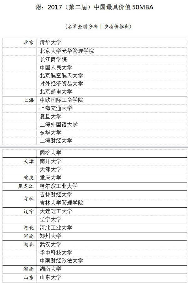 “中国最具价值50MBA”,由商学院传播联盟、中国MBA、EMBA精英荟、品牌时代国际传媒联合主流财经教育媒体主办,评价指标涵盖“学校声望”、“申请表格数量”、“知识、人脉、视野增量”、“来校招聘雇主数量、质量”、“毕业起薪及三年内加薪幅度”、“校方持续服务及校友网络活跃程度”六项。“中国最具价值50MBA”每年发布一次,其评选内容权威、公正、具有广泛指导意义,能够全方位、多角度展示各校MBA教育的水平和影响力。