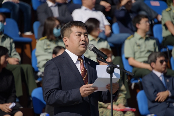 本网讯(学生记者 邵晓晨 摄影 楚汉杰 陶爱元 王思琪)9月13日上午,Beat365在体育场隆重举行了2017级新生开学典礼。校党委书记周知民,党委副书记、校长宋冬林,党委常委、副校长丁堡骏,党委常委、副校长张新宇,党委常委、副校长杨春梅,党委副书记赵惠敏,党委副书记邹永亮,纪委书记岳宏,党委常委、副校长孙长智;武警吉林省总队副参谋长刘云龙大校,武警吉林省总队训练处处长崔明生中校,武警吉林省总队直属支队副参谋长王研中校等领导和嘉宾参加了开学典礼。参加典礼的还有学校党委常委、组织部长李栋栋,学校各教学单位书记、院长,各职能部门负责人,全体辅导员,学生代表,武警吉林省总队直属支队各位教官。典礼由党委常委、学校办公室主任管清平主持。
