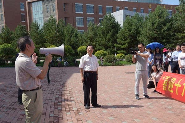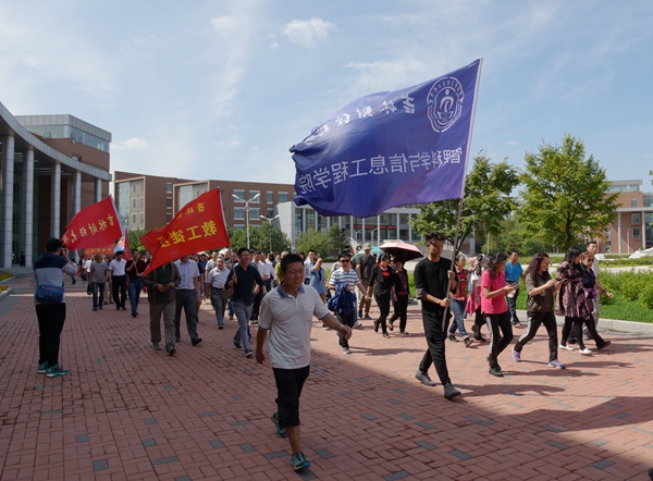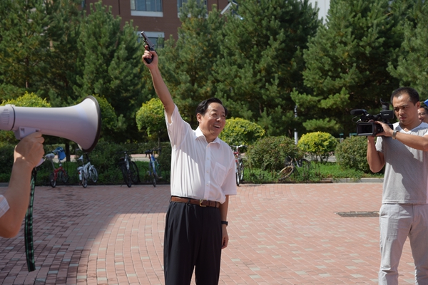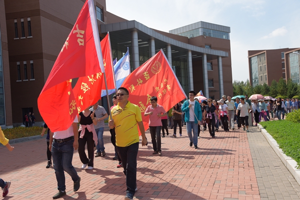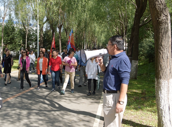 中午11:50分,参加本次校园行活动的教职工在综合楼前集合完毕。在热烈的气氛中,校党委副书记、校长宋冬林代表学校为教职工送去教师节的祝福并宣布徒步行活动正式开始,校党委书记周知民打响了徒步行活动的发令枪。