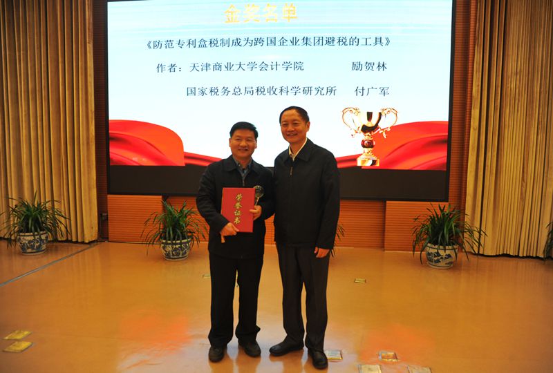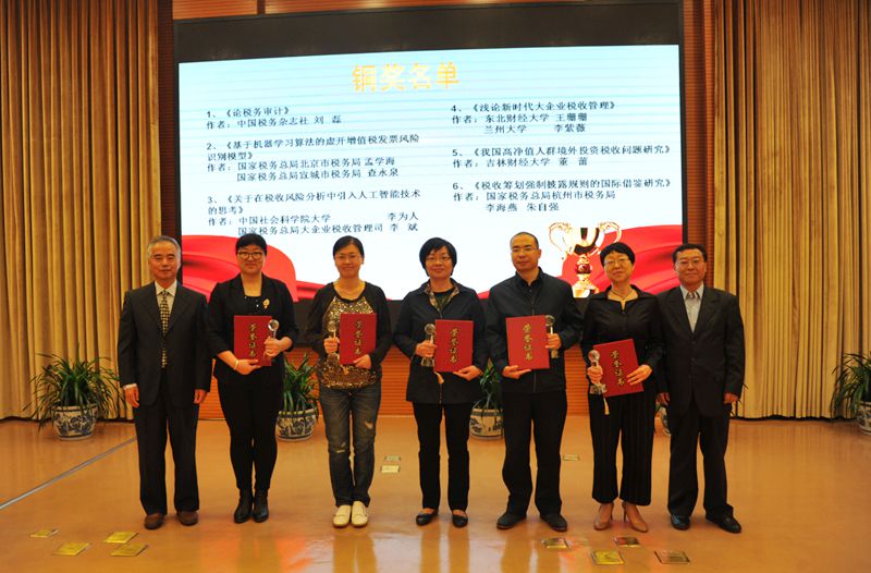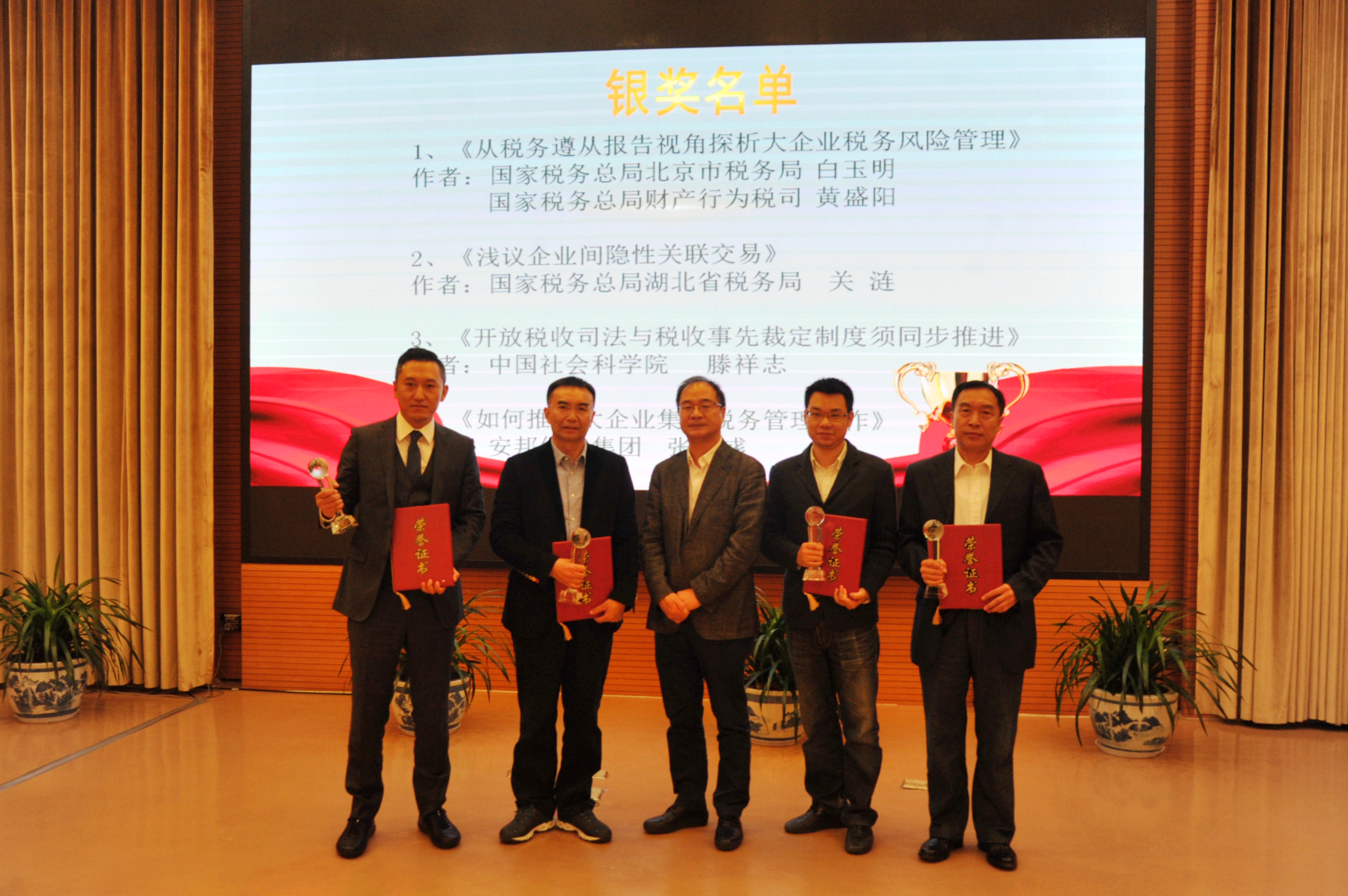 今年获得金鹤奖金奖的成果1名、银奖成果4名、铜奖成果6名。全国政协委员、国家税务总局原副局长张志勇为获得金奖的代表颁发了奖杯和荣誉证书;国家税务总局大企业税收管理司司长缪慧频为获得银奖的代表颁发了奖杯和荣誉证书;北京市国税局原副局长程永昌,中国人民大学财政金融学院副院长、中国大企业税收研究所专家指导委员会主任委员岳树民为获得铜奖的代表颁发了奖杯和荣誉证书。颁奖典礼上,国家税务总局税收科学研究所研究员付广军作为金奖代表分享了研究成果,国家税务总局北京市税务局白玉明、中国社会科学院滕祥志、安邦保险集团张俊彧作为银奖代表分享了研究成果。