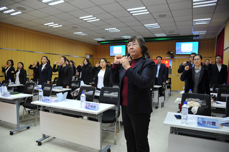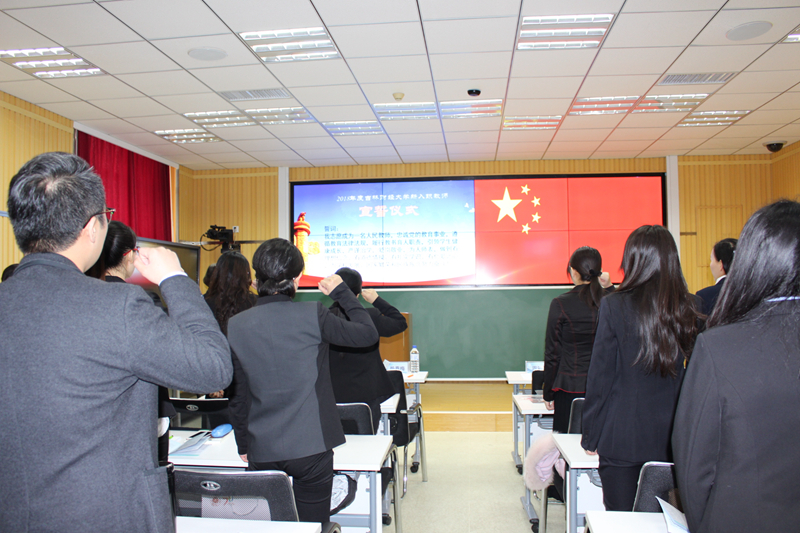仪式第三项是全体新教师宣读人民教师誓词。由校党委常委、副校长杨春梅领誓。全体新教师,面对国旗,庄严宣誓。“我志愿成为一名人民教师,忠诚党的教育事业,遵循教育法律法规,履行教书育人职责,引领学生健康成长,严谨治学,爱岗敬业,为人师表,做到有理想信念、有道德情操、有扎实学识、有仁爱之心,为学校发展、国家繁荣和民族振兴努力奋斗!”