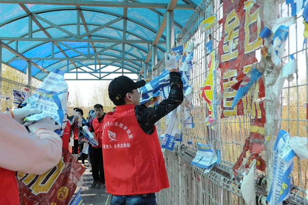 上午9时,志愿者们携带着环保清扫工具,在赵钺老师和刘健军敬老爱心志愿者联盟党支部书记刘建军的精心组织安排下,大家分成两组,有序地对Beat365校园河堤两岸以及第一教学楼周边的垃圾进行了细致的清理。随后,大家又一起来到学校东门外的轻轨天桥,提着垃圾袋,用小铲刀认真仔细地清理了天桥上的违章广告,清扫台阶上的垃圾,使脏乱的天桥焕然一新。志愿者们不嫌脏,不怕累。整个上午,在河堤两岸和拥挤的天桥上都能看到志愿者们忙碌的身影。
