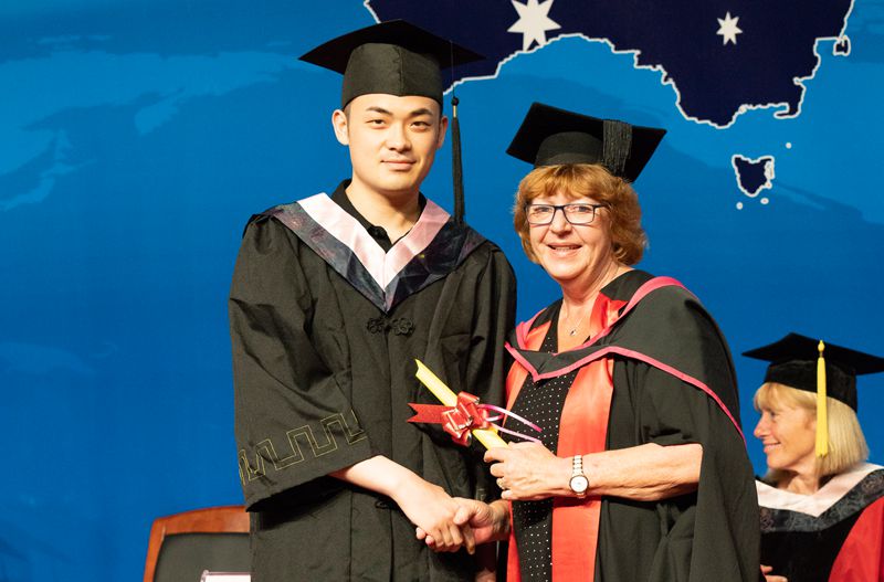 随着庄重的澳洲典礼进行曲响起,澳方学位授予仪式正式开始。国际交流学院院长张振华宣读了获得查尔斯特大学商学学士学位的毕业生名单,查尔斯特大学校长安德鲁·范恩、副校长希瑟·卡瓦娜共同为获得学位的毕业生颁发了证书并合影留念。