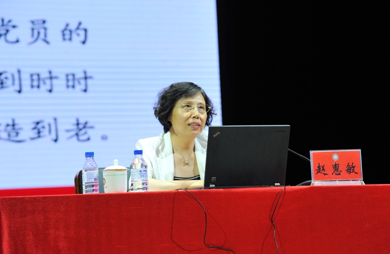 会上,赵惠敏结合学习习近平新时代中国特色社会主义思想和党的十九大精神,作了《学习新党章,做新时代合格共产党员》的专题报告。在报告中,她从党章的重要地位、党章的历史沿革、十九大党章的修改状况、学习新党章应把握的重要内容、做新时代合格共产党员等五个方面作了详细讲解。她指出,党章是党内根本大法,是把握党的正确政治方向的根本准则,是全面从严治党的根本依据,是党员加强党性修养的根本标准。党章的历史发展分为三个阶段:第一阶段是从党的一大至七大时期——革命时期的党章;第二阶段是从党的八大至十一大时期——建设时期的党章;第三阶段是从党的十二大至十九大时期——改革开放时期的党章。她指出,十九大党章修改的重大意义在于体现了马克思主义执政党与时俱进的理论勇气和中国特色社会主义迈入新时代的客观要求。学习新党章应把握十个方面的重要内容:一是深刻理解“两个先锋队”的内涵,准确把握党的性质;二是用发展着的马克思主义武装头脑,准确把握党的指导思想;三是坚持最高纲领和最低纲领统一;四是始终保持党同人民群众的血肉联系;五是坚持党的建设基本要求,准确把握党的领导核心地位;六是坚持把政治标准放在首位;七是坚持民主集中制为核心,准确把握党的组织制度;八是明确党的组织结构,准确把握党的组织体系;九是坚持德才兼备、以德为先的原则,准确把握党的干部路线;十是以政治纪律为核心,准确把握党的纪律。同时还要把握“八个明确”和“十四个坚持。”她强调,党员需做到“五个牢记”,严格遵守党章:一是牢记入党誓词,始终践行诺言;二是牢记政治信仰,始终对党忠诚;三是牢记根本宗旨,始终为民服务;四是牢记党的纪律,始终坚守规矩;五是牢记政治本色,始终积极工作。