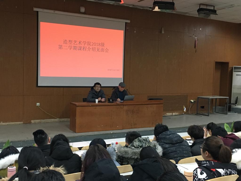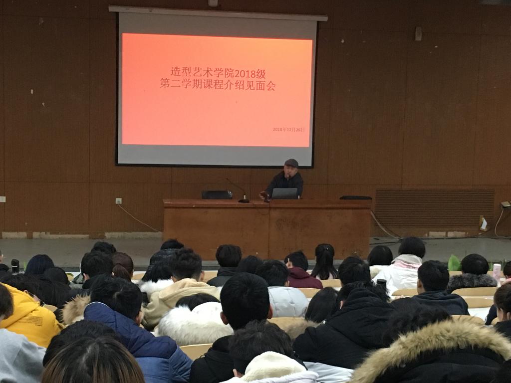 为保证2018级第二学期选课顺利完成,根据学校的要求和安排,12月26日上午造型艺术学院在阶梯一召开2018级第二学期课程介绍见面会。造型艺术学院副院长刘宁及部分任课老师和18级施行学分制的同学参加了本次会议,会议由副院长刘宁主持。