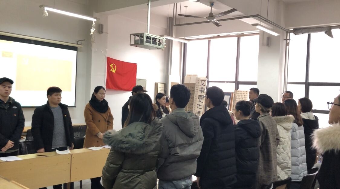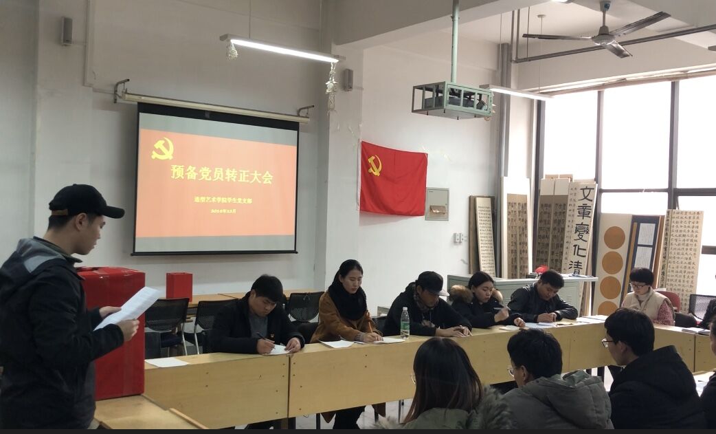 12月25日下午,造型艺术学院学生党支部于二楼多媒体教室召开预备党员转正大会。会议由学生党支部书记王晓琼主持,党总支副书记杜鹏、辅导员许威治列席会议,党员以及部分预备党员参加本次会议。