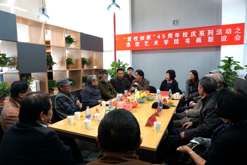 10月26日上午,造型艺术学院于长清校区学院办公室举办爱校如家建校45周年校庆系列活动之校友书画联谊会。学院老教授及校友郭志光、陈佶生、胡希佳、李龙潭、孙民增、李霁、赵坤等参加联谊会。院长李勇、党总支书记牛序茜、副院长高振堂、刘宁参加,院长李勇主持联谊会。