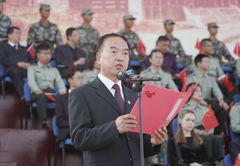 本网讯(学生记者 孙佳宁 摄影 张昊 李大为)9月27日,在全国人民喜迎新中国成立70周年之际,Beat365在体育场隆重举行了2019级新生开学典礼暨军训课总结表彰大会。出席开学典礼暨军事课总结表彰大会的领导和嘉宾有:吉林省教育厅体育卫生与艺术教育处处长胡仁友,副处长孙大龙,中国人民解放军吉林省军区战备建设局参谋刘东旭上尉,优秀校友代表、78级校友、会计7814班崔少华,校党委书记马尚,校党委副书记、校长孙杰光,校党委副书记赵惠敏,校党委副书记邹永亮,校纪委书记岳宏,副校长刘鹤,副校长于金欢。参加本次大会的还有校党委常委、学校办公室主任管清平,校党委常委、组织部部长李栋栋,学校教学单位和各职能部门负责人,全体辅导员,学生代表和中国人民解放军31690部队各位教官。校党委副书记邹永亮主持了大会。