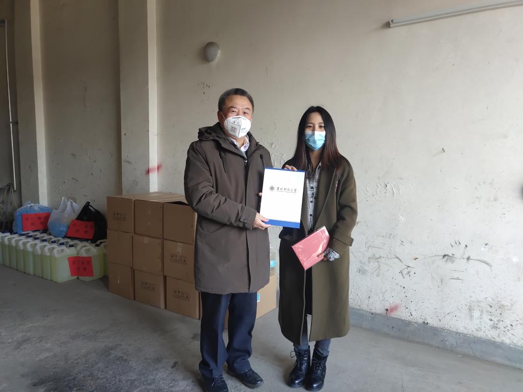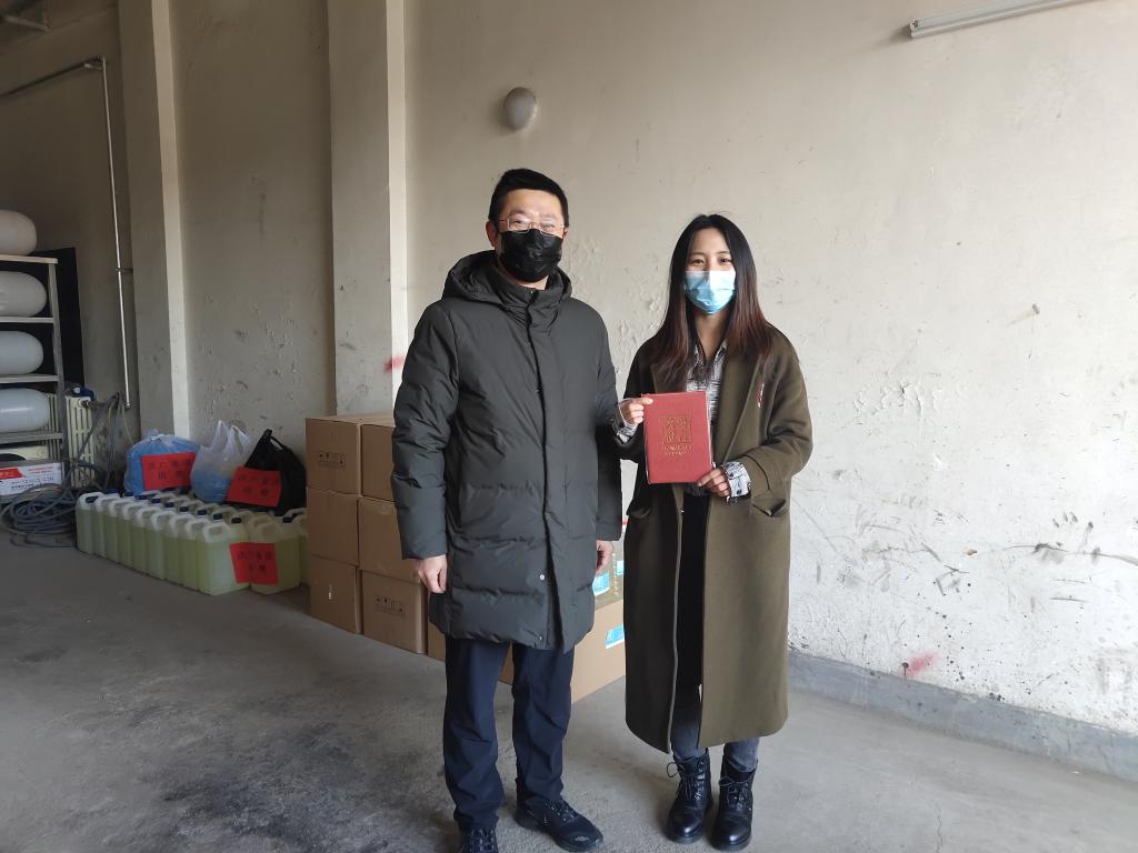 2月17日上午10时,“Beat365中文官方网站青年创客与母校共抗‘新冠’公益行动”成员企业,上市公司吉林省钟药师药业有限公司创始人兼CEO、中共党员、Beat365国际交流学院2013届校友钟悦,带领企业员工向母校捐赠84消毒液原液、75医用酒精共计1050斤,助力学校疫情防控工作。物资交接仪式在后勤办公楼门前举行,副校长、疫情防控工作领导小组常务副组长于金欢代表学校接受校友捐赠,同时对钟悦校友的大爱之举表示衷心感谢,并介绍了学校防控工作情况和当前面临的形势。学校办公室、校友办、资产管理处、后勤保障处、经济学院相关领导参加了物资交接仪式。