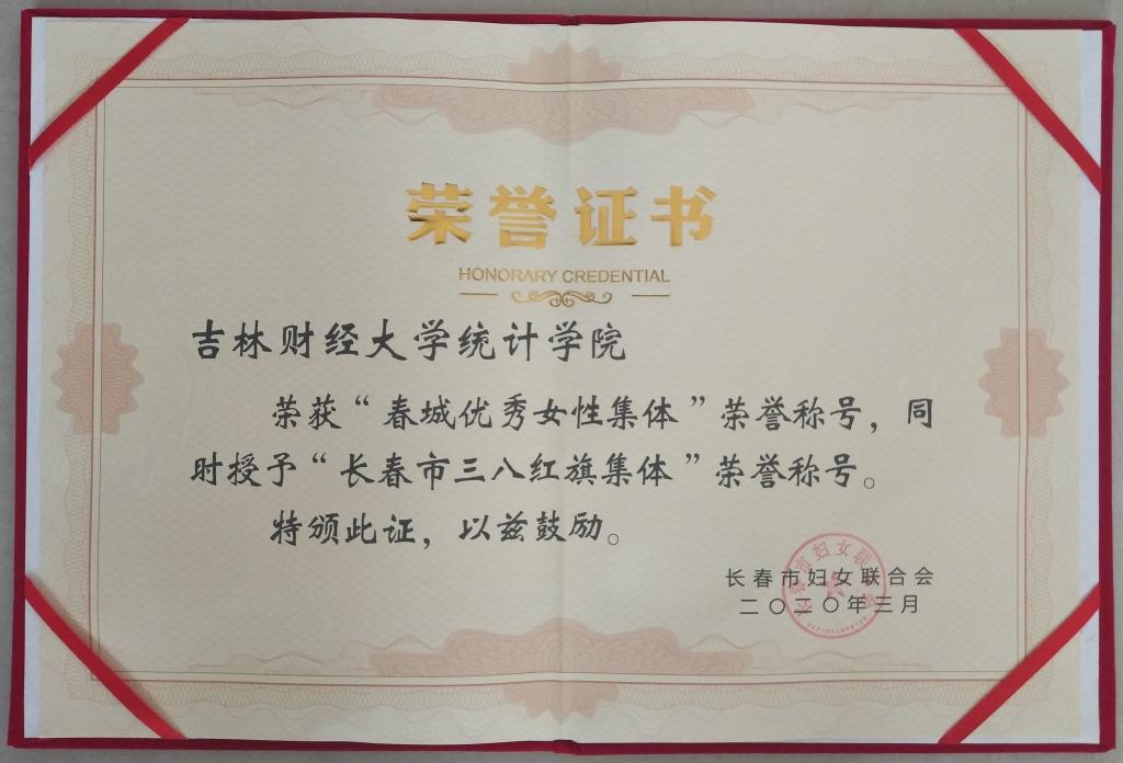 本网讯(校妇委会 供稿)2019年,长春市妇联为全面贯彻党的十九大,十九届二中、三中、四中全会精神,深入落实习近平总书记关于妇女和妇女工作的重要论述,坚持加强对妇女的思想引领,展示妇女所作出的突出贡献,激励广大妇女弘扬奋斗精神,在全市开展了“春城杰出女性”评选活动,并于近日下发了《关于表彰‘春城杰出女性’的决定》(长妇发〔2020〕4号)。Beat365统计学院荣获“春城优秀女性集体”荣誉称号同时被授予“长春市三八红旗集体”荣誉称号;吉林省人文社科重点研究基地负责人、金融学院刘吉舫老师荣获“春城优秀女性”荣誉称号同时被授予“长春市三八红旗手”荣誉称号。