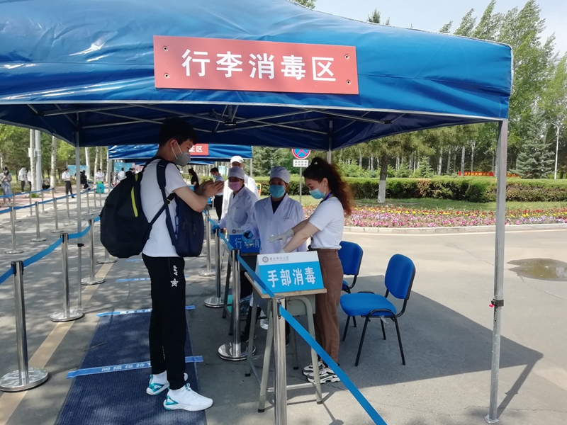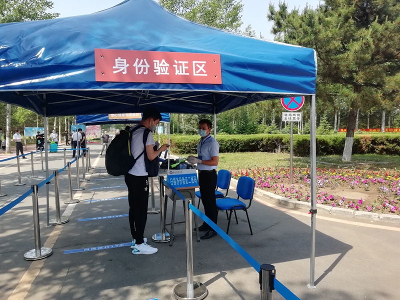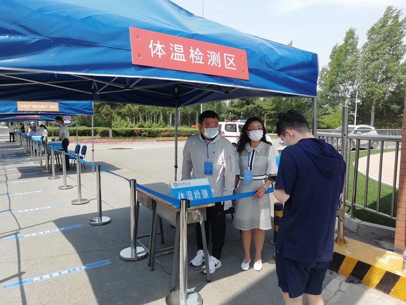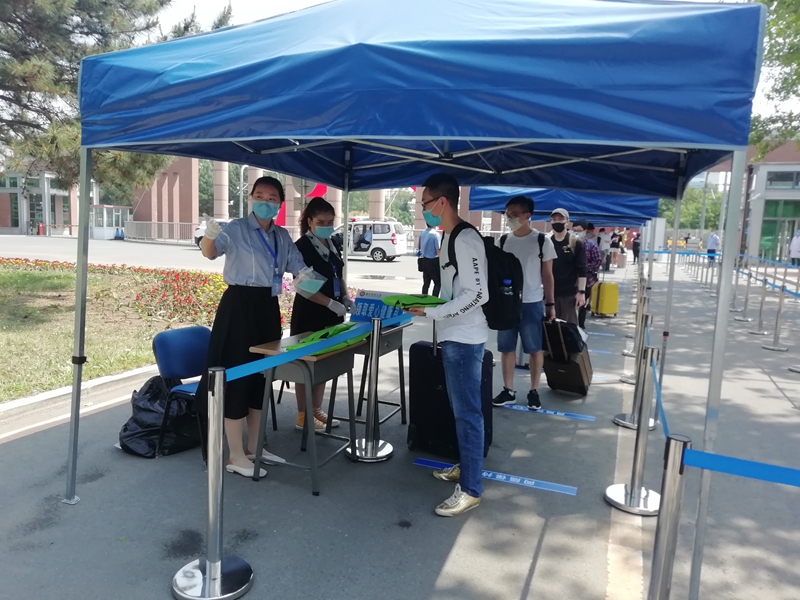 上午9:30,第一批返校学生陆续进入校园,每人间隔1米以上距离,排队进行查验工作。返学学生依次经过体温检测区、“吉祥码”“通信行程卡”查验区、行李消毒区、身份验证区和“爱心健康包”发放区,符合条件的学生方可入校。学生进入宿舍后,还需经过二次体温检测和身份核实,从而切实做好安全保障工作。