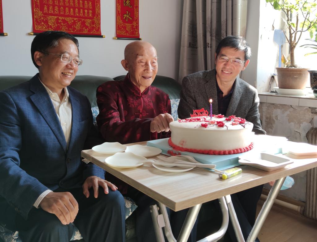 在慰问中,学校领导为赵尚质老师送去了百岁生日蛋糕和慰问金。“赵老师,您身体挺好吧?”“平时谁照顾您的生活?”“子女们经常过来看你吧”在赵尚质老师家中,学校领导马尚、孙杰光、靳国庆仔细询问了赵老师的身体情况、日常生活和家庭情况,并向他介绍了学校近期的工作和发展取得的成就。