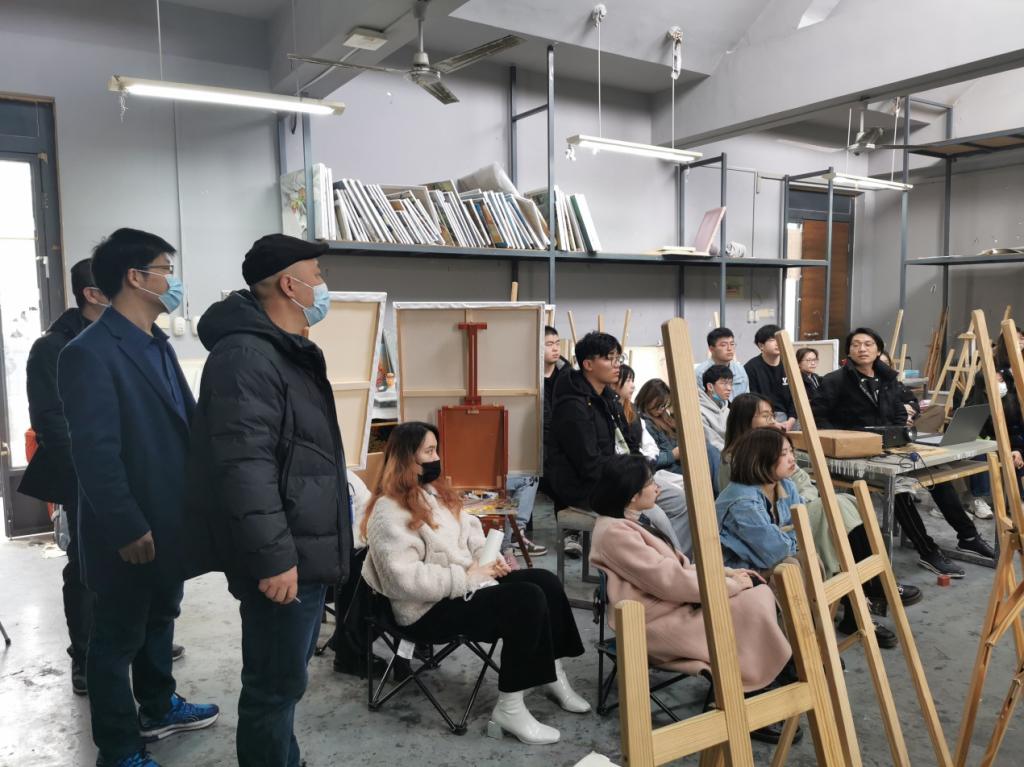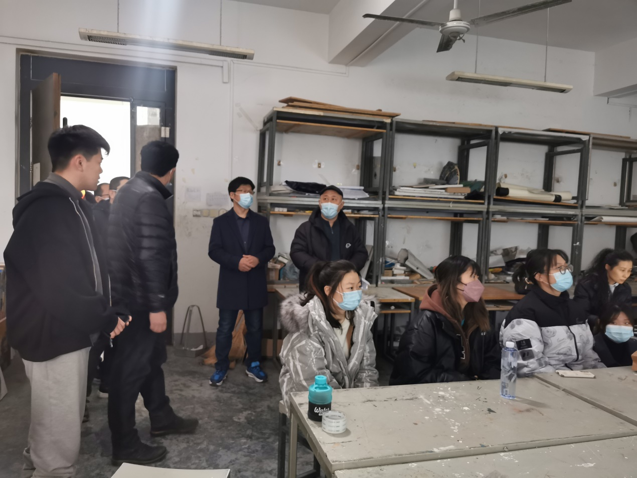 2022年2月28日上午,造型艺术学院院长刘宁,党总支书记李希进及教研室主任和办公室人员对新学期教学工作情况进行督导。